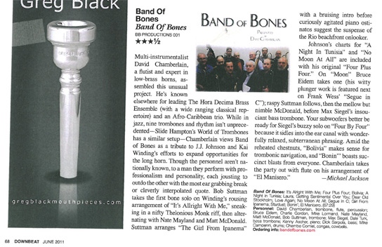 "Band of Bones is a swinging, sliding, sliphorn celebration...a must listen for anyone interested in the past, present, and future of jazz trombone."