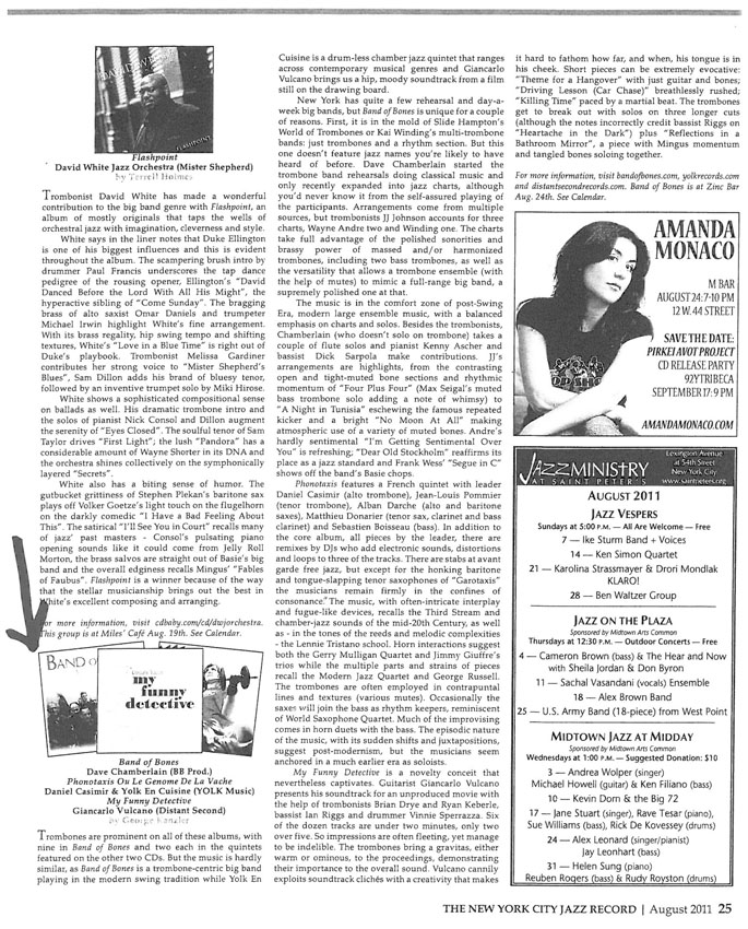 "Every fourth blue moon somebody creates a sound that demands attention. Such is the case with Dave Chamberlain's 'Band of Bones', a debut CD featuring 14 wonderfully inventive and swinging songs. With eight trombones and a sensational rhythm section, 'Band of Bones' is both percussive, rhythmic and just plain fun!"
