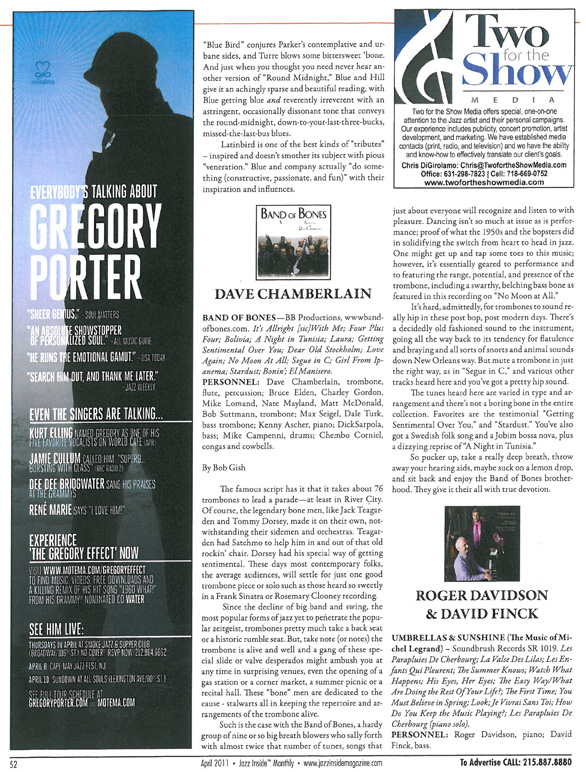 "Every fourth blue moon somebody creates a sound that demands attention. Such is the case with Dave Chamberlain's 'Band of Bones', a debut CD featuring 14 wonderfully inventive and swinging songs. With eight trombones and a sensational rhythm section, 'Band of Bones' is both percussive, rhythmic and just plain fun!"